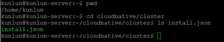 登录服务器Server1上操作, 以 kunlun 用户登录, 进入 cluster 目录,可见其中的 install.json 文件: